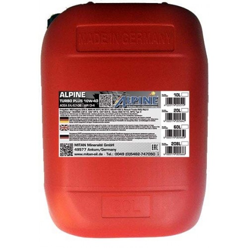 Теги: Alpine Turbo Plus 10W-40, 20 литров, 0100363, Alpine, Грузовое масло Alpine Turbo Plus 10W-40, 10W-40, MB 228.5, MAN M 3277/3377, Volvo VDS-3, Renault VI RLD-2, Mack EO-N, Caterpillar ECF 1-A/ECF 2, Cummins CES 20076/20077/20078, DAF HP, Deutz DQC IV-10, Detroit Diesel 93K215, Global DHD-1, Mack EO-M+, MTU Typ 3, Renault RXD, Scania LDF-2.